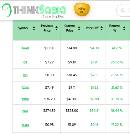 Gainers: #AKAN #QS #TRT #TZOO #TXNU #WST #YCBD